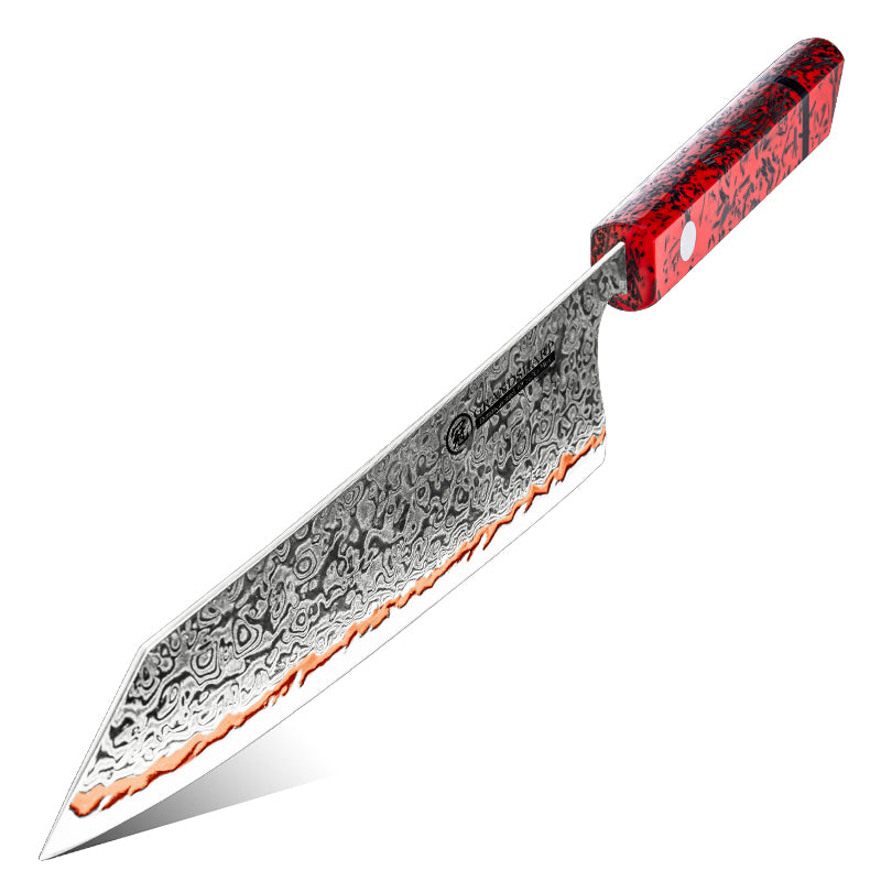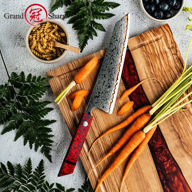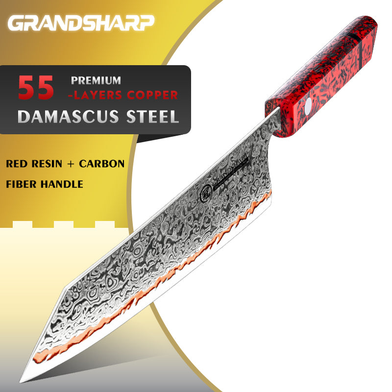 Grandsharp 8 Inch Kiritsuke Knife High Quliaty 55 Layers Copper Damascus Steel Kitchen Knives Red Resin + Carbon Fiber Handle