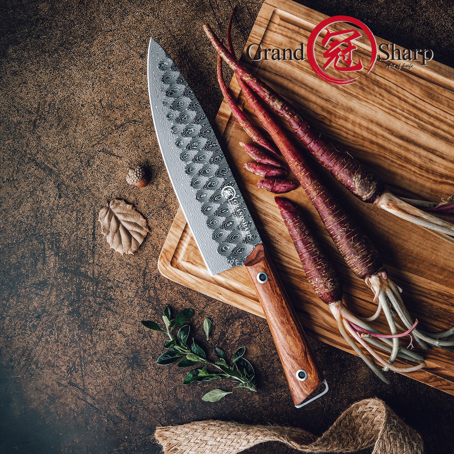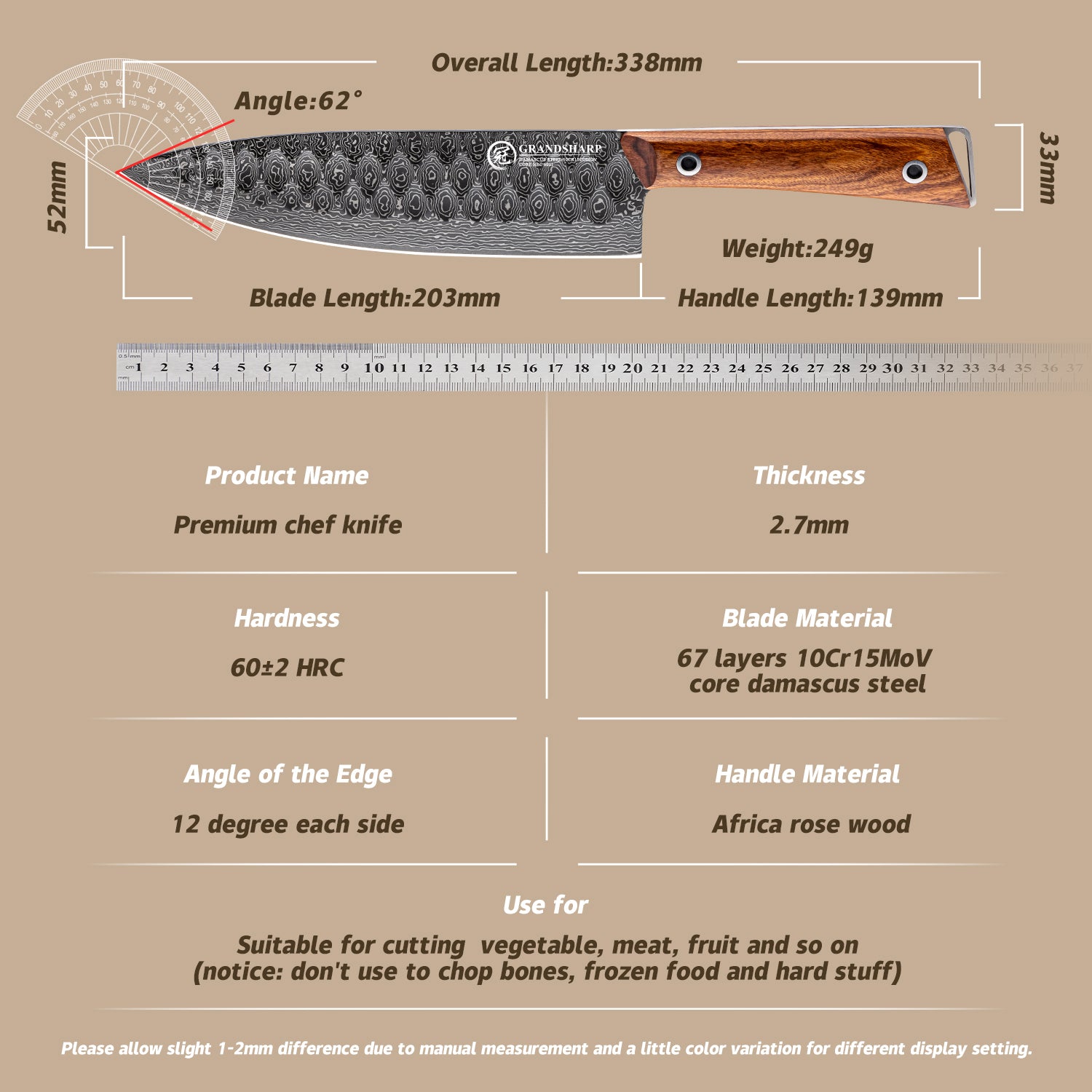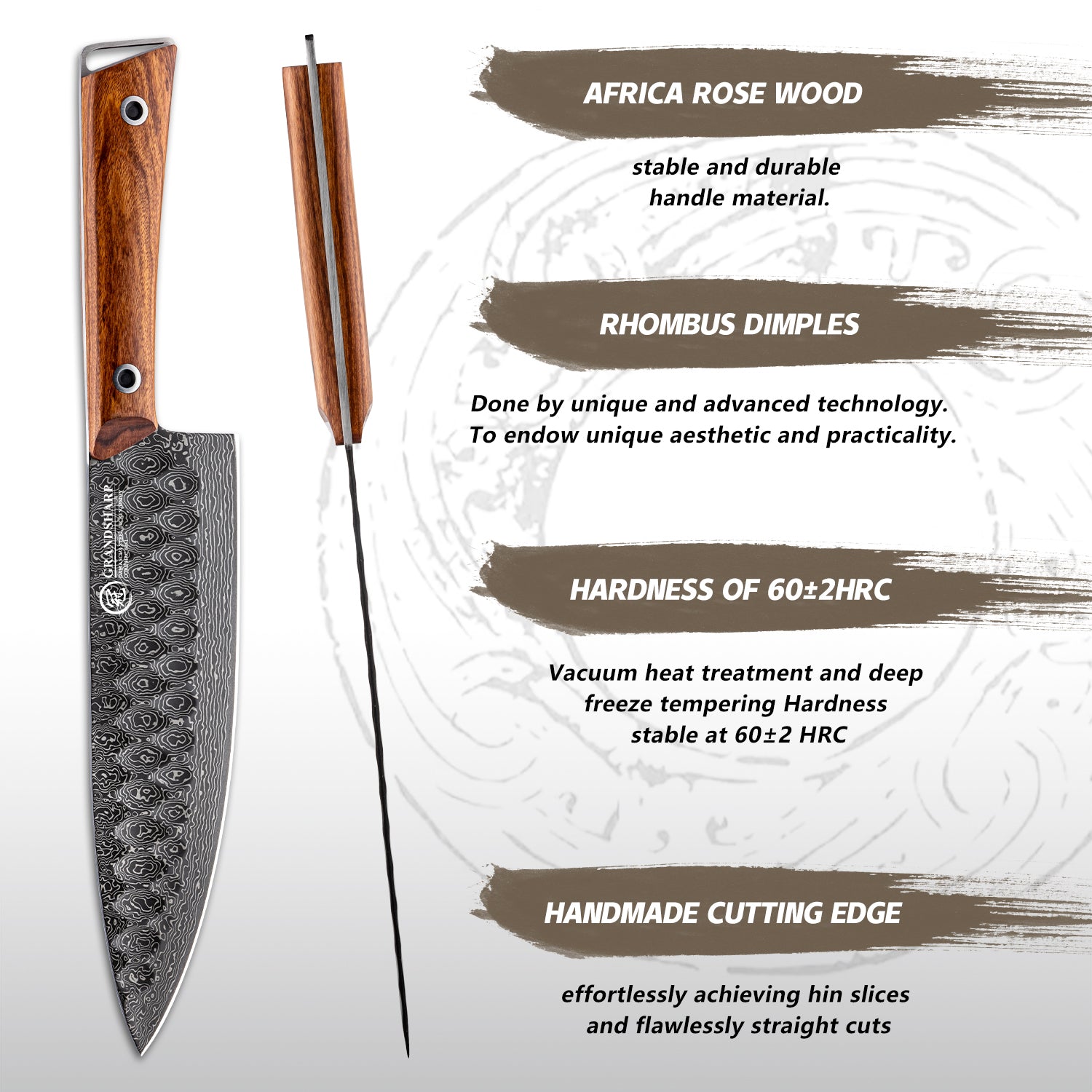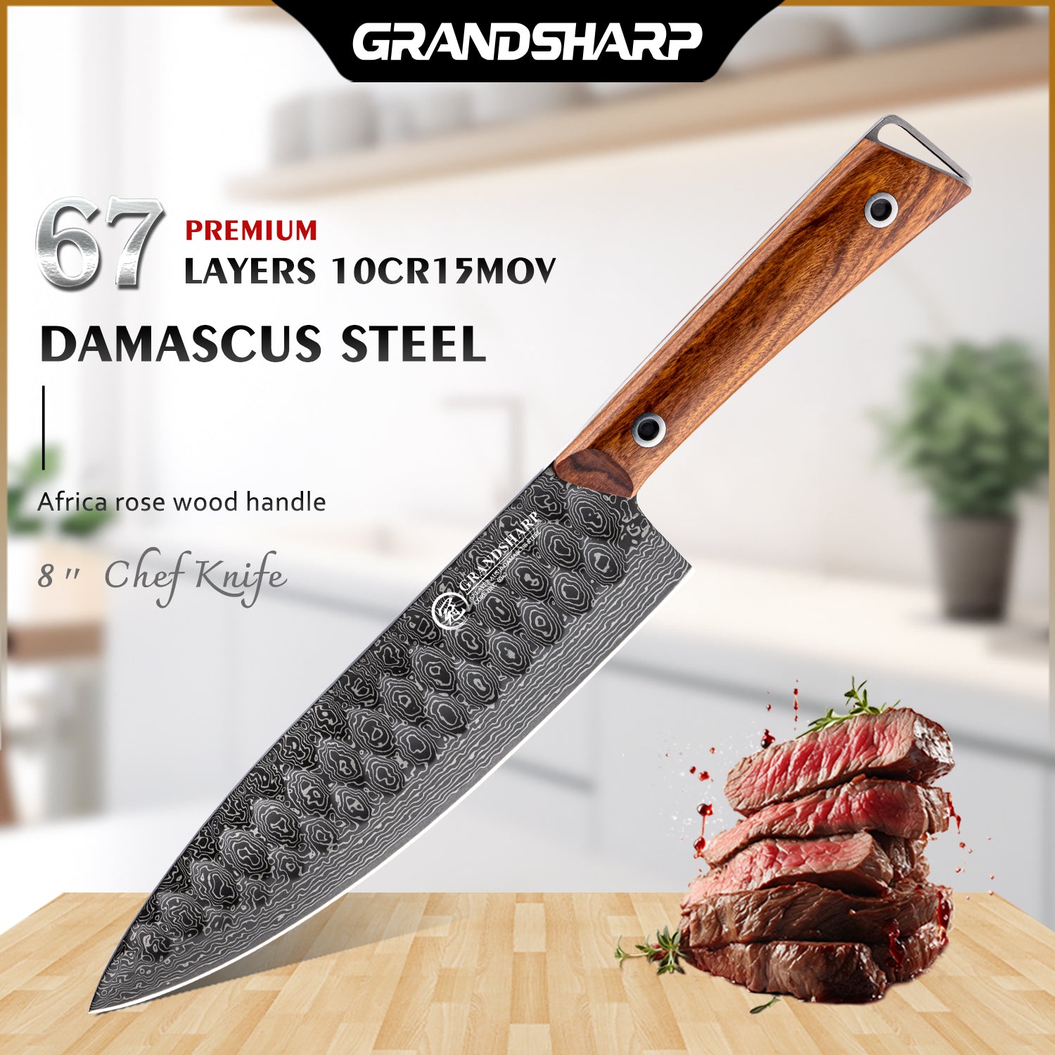 Grandsharp 8 Inch Premium Chef Knife 67 Layers 10Cr15MoV Core Damascus Steel Africa Rose Wood Handle with Gift Box Santoku