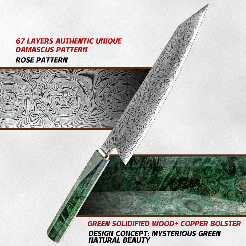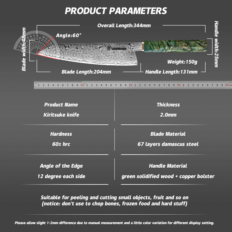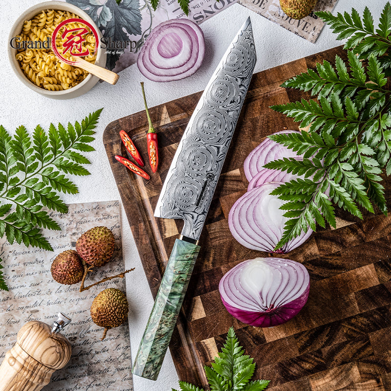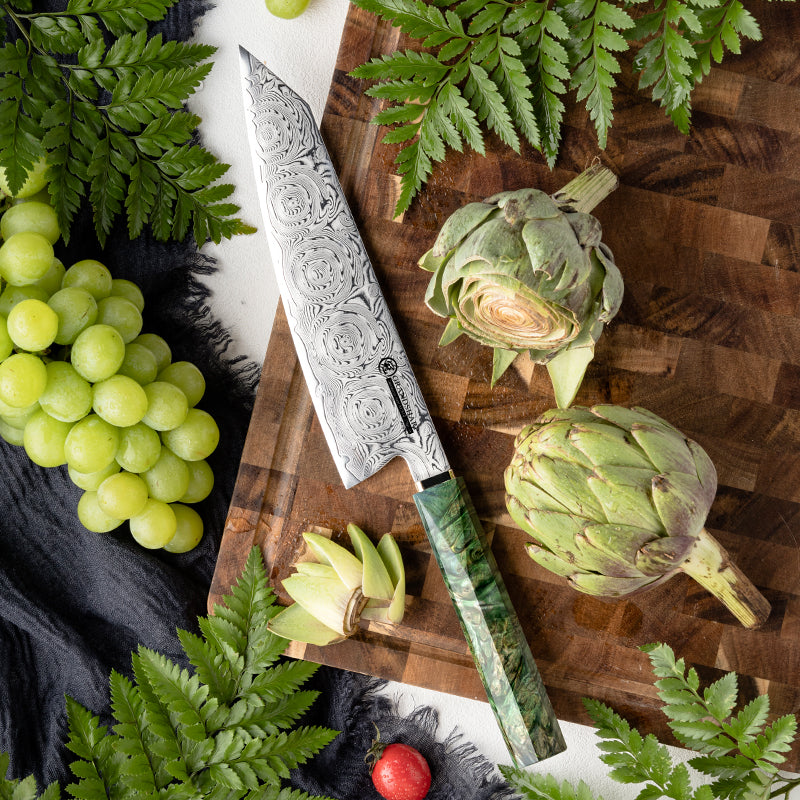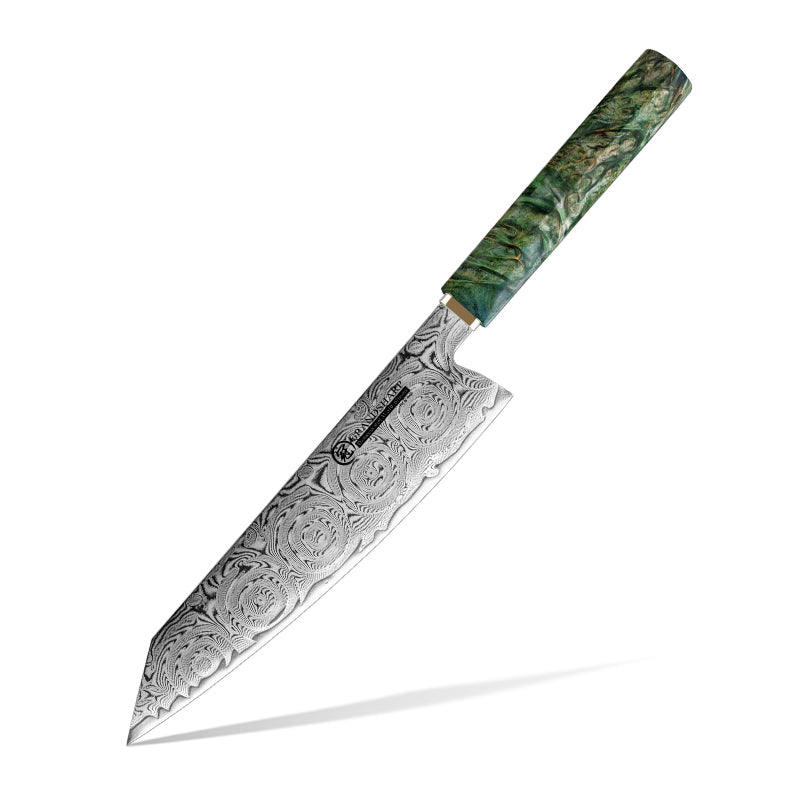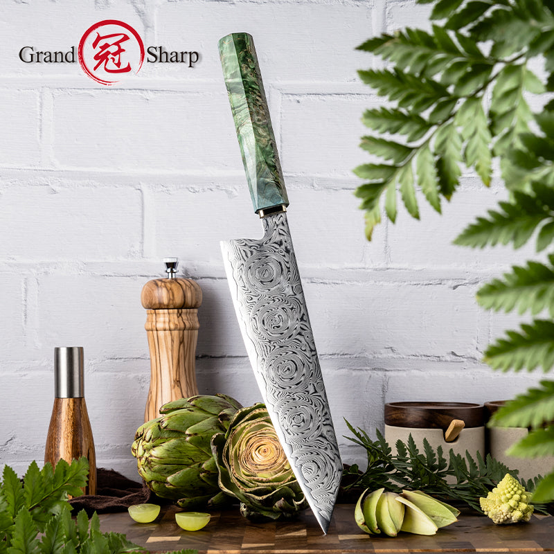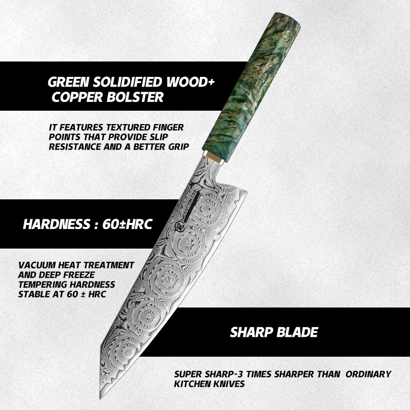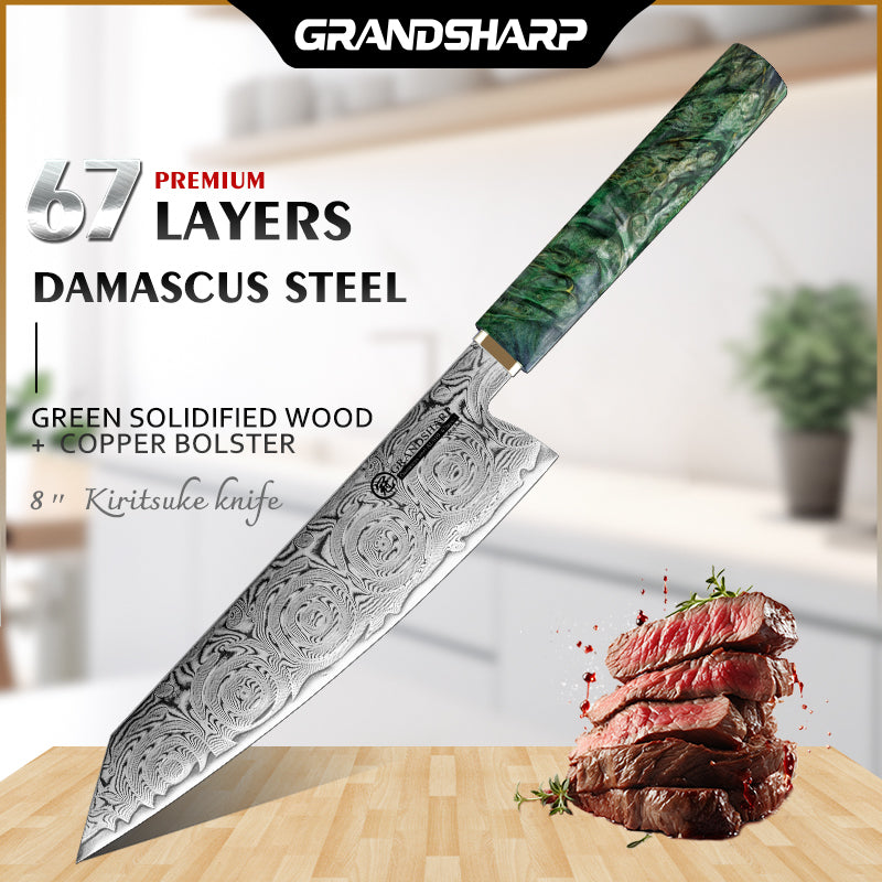 Grandsharp 8'' Kiritsuke Knife Damascus Steel Kitchen Knives Meat Vegetable Slicer Cooking Tools Green Solidified Wood Handle